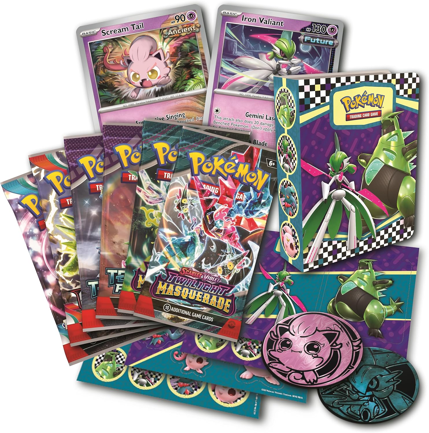 - The Pokémon Trading Card Game: Collector Chest includes 6 Pokémon TCG booster packs, 2 foil cards featuring Scream Tail and Iron Valiant, and 2 Pokémon coins featuring Scream Tail and Iron Valiant.